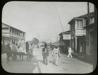Scene of a street in Santiago, Cuba showing pedestrian traffic including a team of Black laborers near a horse-drawn dray. In the left, six Black men sit and stand around the dray. Buildings line both sides of the street with signs in Spanish. Men walk in front of the buildings and in the street. Two men walk towards the viewer. Several horse-drawn drays and wagons are visible in the background.