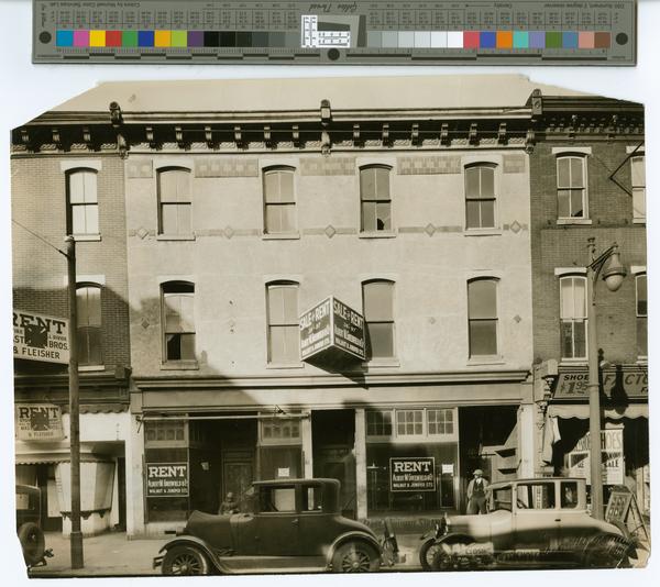 Real estate photograph commissioned by Albert M. Greenfield & Co. probably for publication in the firm's monthly Real Estate Bulletin depicting a three-story commercial building containing empty storefronts. Building contains signage for Greenfield & Co. offering the building for sale or rent. In the left, a woman bundled against the cold sits on the front stoop. In the center, an African American man, attired in a cap, a white collared shirt, a tie, a waistcoat with a pocket watch chain, an overcoat, and pants, stands on the sidewalk with his hands in his pockets and looks left. There is a partial view of an adjoining shoe store and two automobiles.
