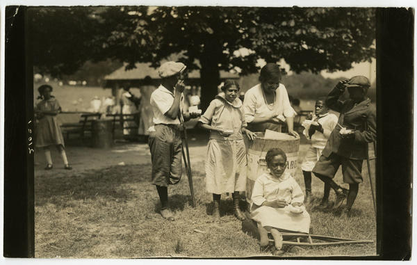 Depicts a smiling African American woman serving ice cream from a barrel to African American children with disabilities in Burholme Park, Philadelphia. The children, most with crutches, surround the barrel eating their ice cream. In the foreground, the young girl sits holding a dish of ice cream while her crutches lie on the grass in front of her. Three boys and one girl stand and hold dishes of ice cream. People stand and sit on benches in the background. Burholme, originally the country seat of railroad magnate Joseph Waln Ryerss and an Underground Railroad station during the Civil War, became a public park at the death bequest of Ryerss' son, Robert, in 1868.