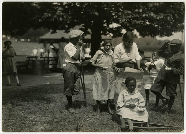 Depicts a smiling African American woman serving ice cream from a barrel to African American children with disabilities in Burholme Park, Philadelphia. The children, most with crutches, surround the barrel eating their ice cream. In the foreground, the young girl sits holding a dish of ice cream while her crutches lie on the grass in front of her. Three boys and one girl stand and hold dishes of ice cream. People stand and sit on benches in the background. Burholme, originally the country seat of railroad magnate Joseph Waln Ryerss and an Underground Railroad station during the Civil War, became a public park at the death bequest of Ryerss' son, Robert, in 1868.