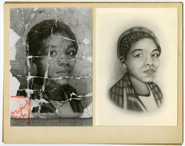 Sample of photo restoration work depicting a damaged and touched up bust-length portrait mounted side-by-side of a young African American woman. The woman, attired in a beret, a white shirt, and a plaid jacket, faces right with her eyes looking left.