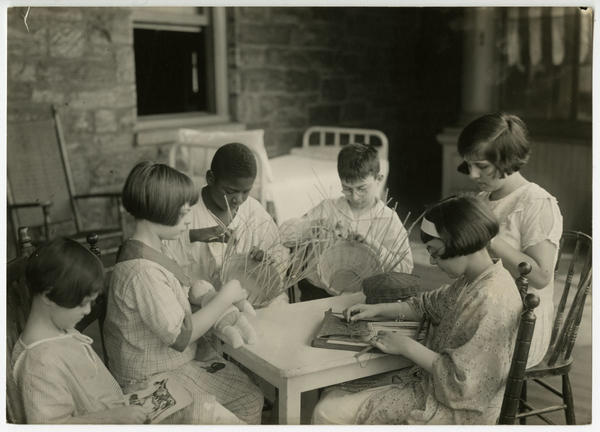 Depicts children, including an African American boy, playing and performing handicrafts probably as occupational therapy, while seated at a table near a hospital bed on an outside porch. Six girls and boys sit around the table and weave baskets, a loom, hold a baby doll, and hold an image of a cow.