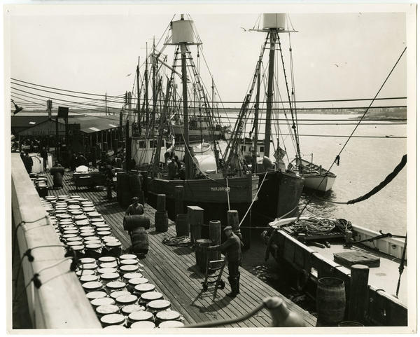 View showing an active pier on the Delaware River depicting dock workers, including African Americans, transporting barrels and ice from a "Retail Ice" shed on the pier. In the left, barrels line the pier. In the right, men stand within several docked ships, probably fishing boats, which include the "Majorie" and "Josephine."