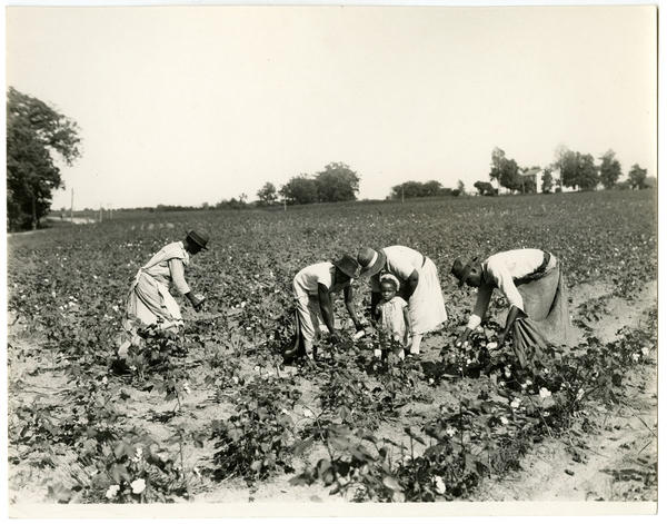 Scene showing three African American men and an African American woman as they pick cotton in a large field. In the foreground, the workers, attired in hats, bend over at the waist as they harvest the cotton and place it in bags that they carry. A very young African American girl stands in front of the woman and looks at the viewer. A house is visible in the right background.