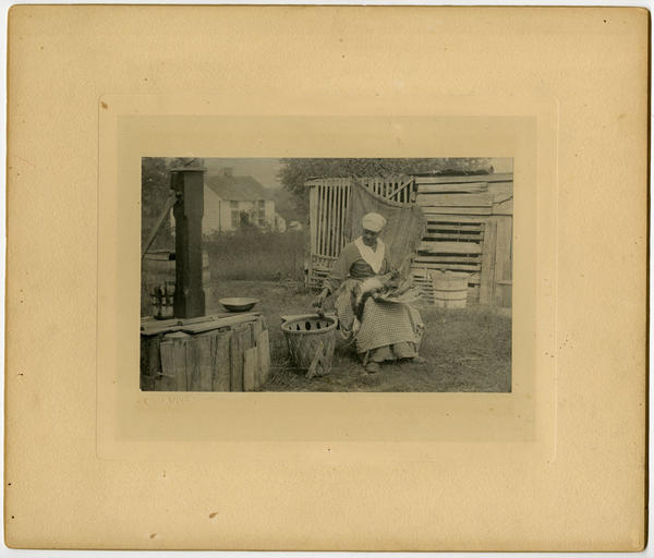 Genre scene depicting an older African American woman, attired a white head kerchief, a neckerchief, a long-sleeved dress,