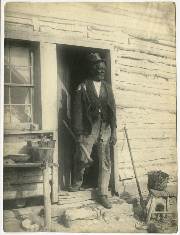 Depicts an older African American man, attired in torn and worn clothing, exiting through the doorway of his wooden house