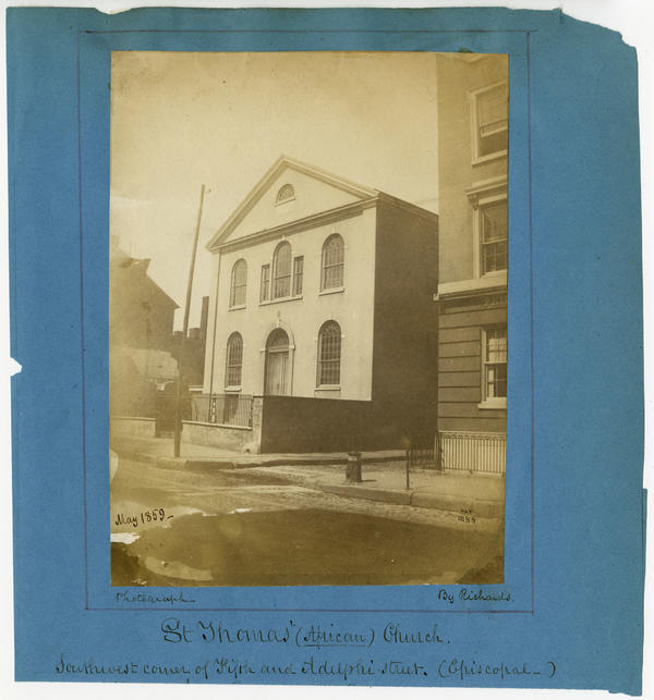 Exterior view of the first African Episcopal church in the United States at the corner of Fifth and Adelphi (i.e., Saint James)