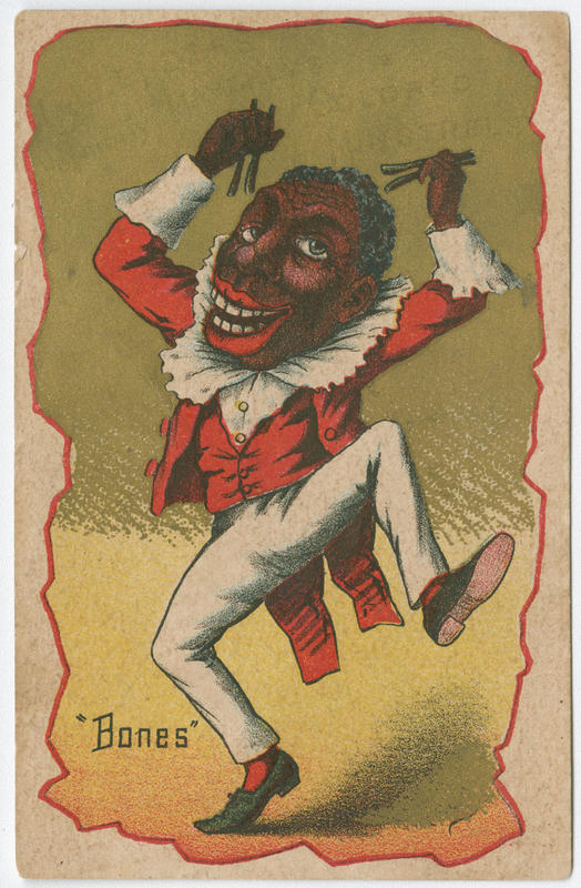 Set of racist trade cards, some captioned, depicting African American male and female caricatures and stereotypes. Figures portrayed with malproportioned facial features. Captioned cards include "A New Coon in Town" showing an African American dandy, with a cigarette in his mouth, and attired in a grey bowler, purple jacket with flower boutonnière, red stiff-collared shirt, blue checkered pants, and red socks accessorized with yellow gloves, a monocle, and an umbrella; "Bones" showing an African American minstrel performer, attired in a ruffled clown collared shirt and red jacket with tails while playing sticks above his head and side kicking; and "Did you see me" showing a comic African American male figure, holding his bowler in the air and with one foot extended toward the viewer ("Did you see me" written on the sole of his foot). Uncaptioned cards depict an African American minstrel figure, attired in a ruffled collared shirt, seated, and holding a tambourine on his knee (probably originally captioned 'I don't do this for a livin"); an older African American woman, attired in a bonnet, shawl, and apron, resembling a cook and smoking a pipe (probably originally captioned "Just like the old me"); and a curvaceous African American woman attired in a red hat, square neck, knee-length dress, sash, and red stockings while side stepping. Cards advertise the saloon operated by Franz Aman at the address listed 1886-1888, a period when "Coon" songs were a fad. The "Bones" and "Tambourine" figures were often a part of the standard first act of a three-act minstrel performance