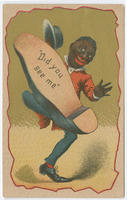Set of racist trade cards, some captioned, depicting African American male and female caricatures and stereotypes. Figures portrayed with malproportioned facial features. Captioned cards include "A New Coon in Town" showing an African American dandy, with a cigarette in his mouth, and attired in a grey bowler, purple jacket with flower boutonnière, red stiff-collared shirt, blue checkered pants, and red socks accessorized with yellow gloves, a monocle, and an umbrella; "Bones" showing an African American minstrel performer, attired in a ruffled clown collared shirt and red jacket with tails while playing sticks above his head and side kicking; and "Did you see me" showing a comic African American male figure, holding his bowler in the air and with one foot extended toward the viewer ("Did you see me" written on the sole of his foot). Uncaptioned cards depict an African American minstrel figure, attired in a ruffled collared shirt, seated, and holding a tambourine on his knee (probably originally captioned 'I don't do this for a livin"); an older African American woman, attired in a bonnet, shawl, and apron, resembling a cook and smoking a pipe (probably originally captioned "Just like the old me"); and a curvaceous African American woman attired in a red hat, square neck, knee-length dress, sash, and red stockings while side stepping. Cards advertise the saloon operated by Franz Aman at the address listed 1886-1888, a period when "Coon" songs were a fad. The "Bones" and "Tambourine" figures were often a part of the standard first act of a three-act minstrel performance