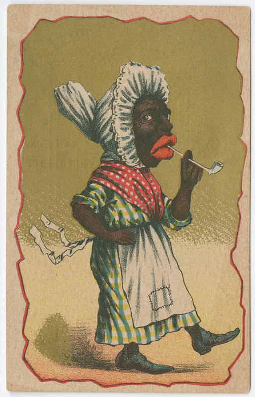 Set of racist trade cards, some captioned, depicting African American male and female caricatures and stereotypes. Figures portrayed with malproportioned facial features. Captioned cards include "A New Coon in Town" showing an African American dandy, with a cigarette in his mouth, and attired in a grey bowler, purple jacket with flower boutonnière, red stiff-collared shirt, blue checkered pants, and red socks accessorized with yellow gloves, a monocle, and an umbrella; "Bones" showing an African American minstrel performer, attired in a ruffled clown collared shirt and red jacket with tails while playing sticks above his head and side kicking; and "Did you see me" showing a comic African American male figure, holding his bowler in the air and with one foot extended toward the viewer ("Did you see me" written on the sole of his foot). Uncaptioned cards depict an African American minstrel figure, attired in a ruffled collared shirt, seated, and holding a tambourine on his knee (probably originally captioned 'I don't do this for a livin"); an older African American woman, attired in a bonnet, shawl, and apron, resembling a cook and smoking a pipe (probably originally captioned "Just like the old me"); and a curvaceous African American woman attired in a red hat, square neck, knee-length dress, sash, and red stockings while side stepping. Cards advertise the saloon operated by Franz Aman at the address listed 1886-1888, a period when "Coon" songs were a fad. The "Bones" and "Tambourine" figures were often a part of the standard first act of a three-act minstrel performance