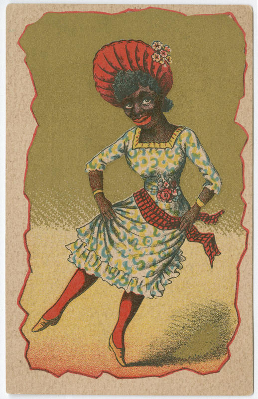 Set of racist trade cards, some captioned, depicting African American male and female caricatures and stereotypes. Figures portrayed with malproportioned facial features. Captioned cards include "A New Coon in Town" showing an African American dandy, with a cigarette in his mouth, and attired in a grey bowler, purple jacket with flower boutonnière, red stiff-collared shirt, blue checkered pants, and red socks accessorized with yellow gloves, a monocle, and an umbrella; "Bones" showing an African American minstrel performer, attired in a ruffled clown collared shirt and red jacket with tails while playing sticks above his head and side kicking; and "Did you see me" showing a comic African American male figure, holding his bowler in the air and with one foot extended toward the viewer ("Did you see me" written on the sole of his foot). Uncaptioned cards depict an African American minstrel figure, attired in a ruffled collared shirt, seated, and holding a tambourine on his knee (probably originally captioned 'I don't do this for a livin"); an older African American woman, attired in a bonnet, shawl, and apron, resembling a cook and smoking a pipe (probably originally captioned "Just like the old me"); and a curvaceous African American woman attired in a red hat, square neck, knee-length dress, sash, and red stockings while side stepping. Cards advertise the saloon operated by Franz Aman at the address listed 1886-1888, a period when "Coon" songs were a fad. The "Bones" and "Tambourine" figures were often a part of the standard first act of a three-act minstrel performance