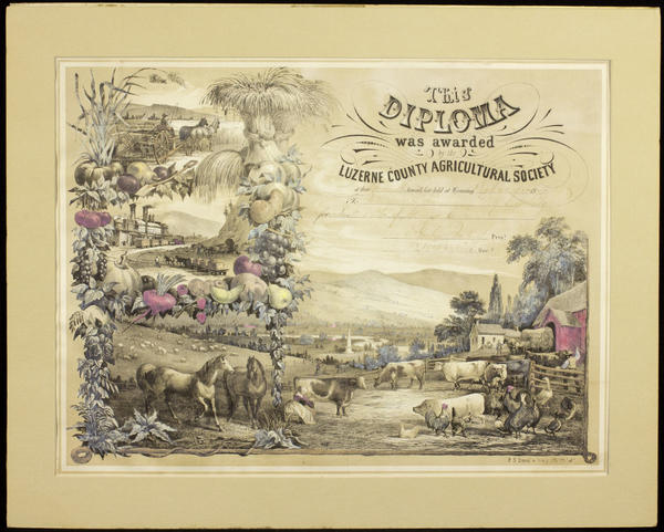 Diploma containing two vignettes and and a dominant scene symbolizing agriculture separated by borders comprised of sheaves of wheat, a shovel, farm produce, and vinery. In the upper right, vignettes depict a farmer reaping his field with a horse-drawn reaper and an industrial view of a train passing a coal breaker factory across from a coal mine in which horse-drawn coal cars arrive and depart. The dominant scene shows a farm with livestock, including a pig, turkeys, chickens, and ducks milling the grounds near a woman milking a cow while farmhands corral cows out of a yard, transport a wagon of hay from a barn, and plow a field. View also shows horses before a pasture of grazing sheep and other homesteads, the Wyoming Monument (erected in 1833 in memory of victims of the Wyoming Massacre 1778), and treescaped hills in the distance. The Luzerne County Agricultural Society was founded in 1858 by persons interested in farming and gardening with the mission "to foster and improve agriculture, horticulture, and the domestic and household arts." The first annual fair was held in 1859 and stopped after circa 1879 and before 1891.