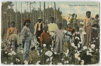Postcard depicting a group portrait of African American cotton pickers, predominantly women and children, in a cotton field. Show the workers stopped from their work and posed toward the viewer. One of the women holds a baby. A wooded area is seen in the background.