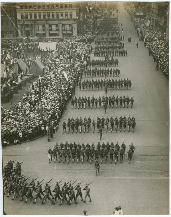Last parade of drafted men from Dix Camp before going over seas, passing Broad & Filbert