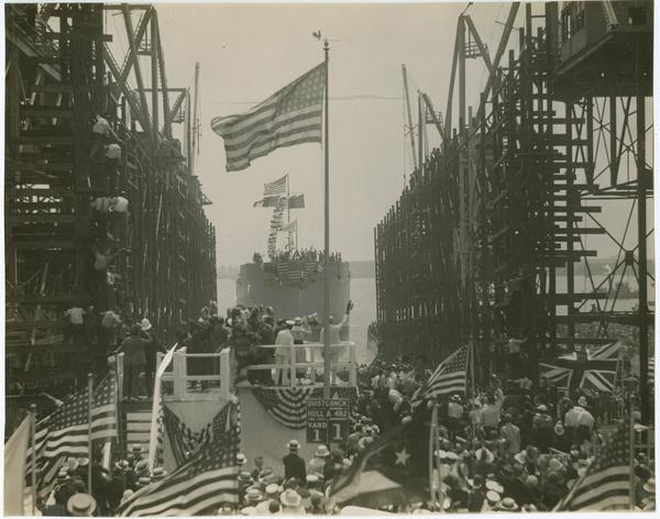 President and Mrs. Wilson launch first ship at Hog Island Aug. 5, 1918