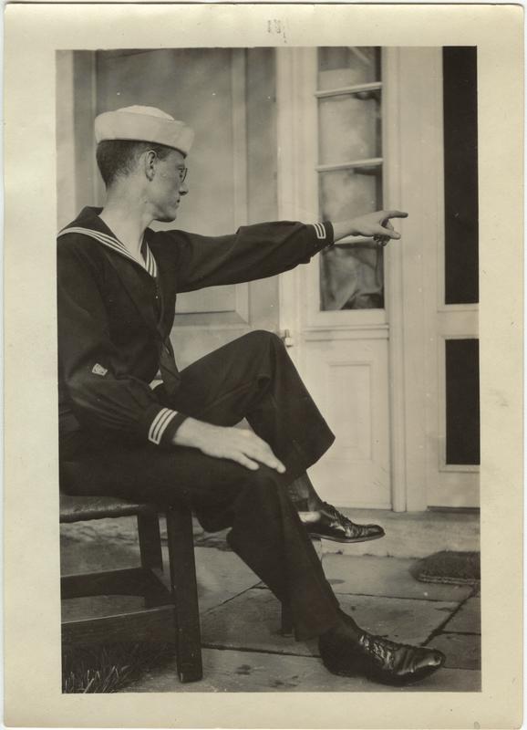 [Study for World War One poster depicting sailor sitting on a porch pointing]