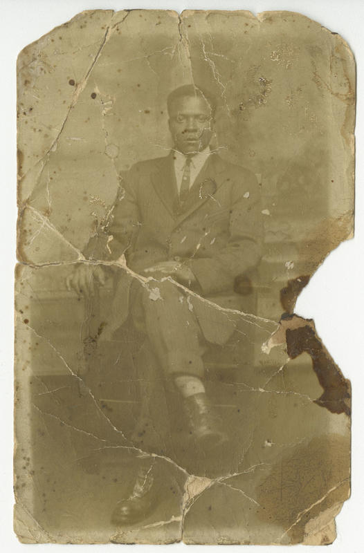 Full-length studio portrait showing Showell, seated in a chair, and attired in a suit, tie, and spats. His legs are crossed, with one hand resting on his knee, and the other hand resting on the arm of the chair. A studio backdrop is visible in the background. Showell, a resident of South Philadelphia, worked as a laborer with the Adams Express Co. He also served in World War I in the 368th Infantry, part of the African American 92nd Infantry Division known as the "Buffalo Soldiers."