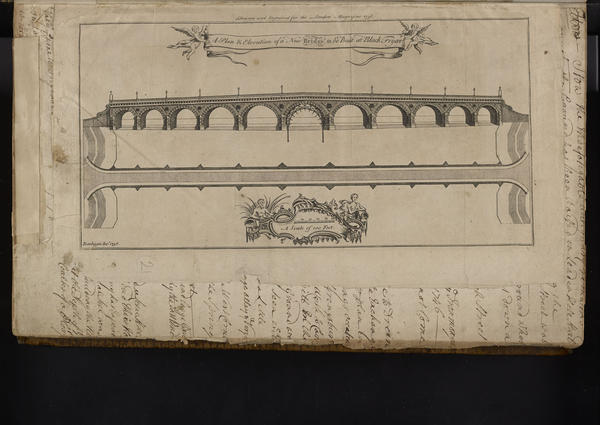 Lancelot Dowbiggin's design for the Blackfriars Bridge was rejected in favor of a design by Robert Mylne, but the plate was published in the London magazine in April 1756.