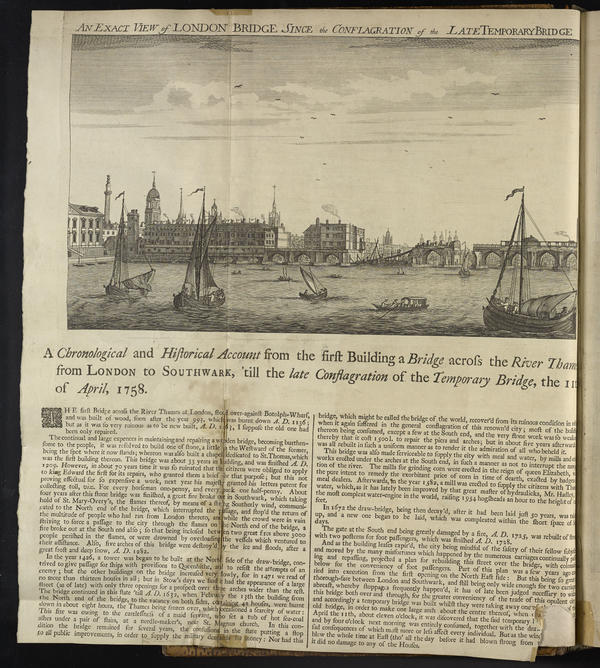 A Chronological and historical account from the first building a bridge across the River Thames, from London to Southwark, 'till the late conflagration of the temporary bridge, the 11th of April, 1758.