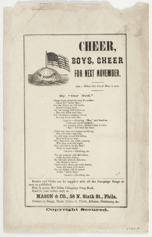 a. Adv: Dealers and Clubs can be supplied with Cam- paign Songs [by] Mason and Co.; Copyright Secured. A-J border; bust of McClellan. 23.5 x 15."2 cm.