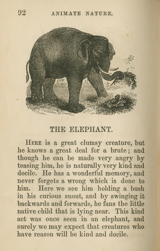 Illustration appears in The Show of animals (Philadelphia, between 1832 and 1860?), p. 14. The Show of animals was listed in American Sunday-School Union catalogues from May 1832 to July 1860.