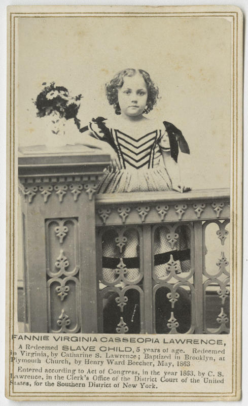 Fannie Virginia Casseopia Lawrence [graphic] : A redeemed slave child, 5 years of age. Redeemed in Virginia, by Catherine S. Lawrence; baptized in Brooklyn, at Plymouth Church, by Henry Ward Beecher, May, 1863. / Kellogg Brothers, 279 Main St. Hartford, Conn.