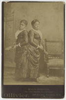 Full-length portrait of the African American conjoined twins and performers posed near an arm chair. The women are attired in a long-sleeved damask dress with front ruching. Each wears a lace neckerchief, an adornment in her hair, and earrings. Millie (on the left) holds a fan in her hands. A backdrop illustrated with a changing screen is visible in the background. The twins were born in Whiteville, North Carolina on July 11, 1851, to Jacob and Monemia McKoy who were enslaved to Jabez McKay. Various enslavers and managers exhibited the twins nationally and internationally. By the end of the 1880s, the twins retired to a farm in their home state of North Carolina.