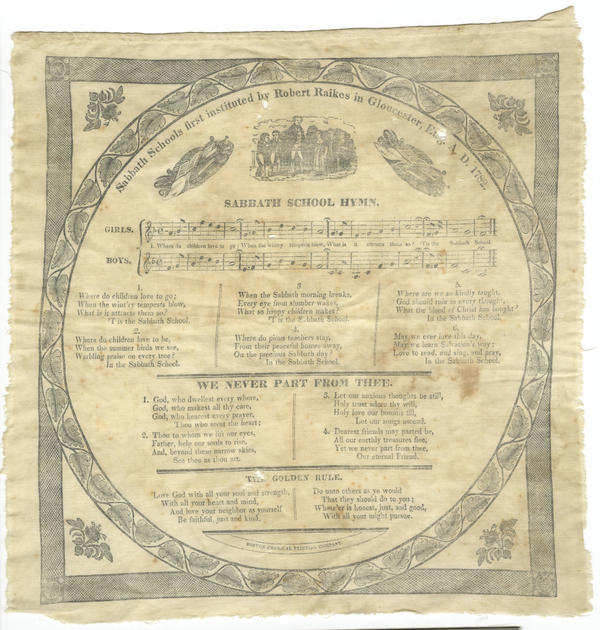 Decorative handkerchief with three hymns, the first with music, Sabbath School Hymn; We Never Part From Thee; The Golden Rule. Decorative border with a pattern of leaves encircling the text. Image of a Sunday school teacher and children at the top along with open books. Stamped, Boston Chemical Printing Company, at the bottom. Printed within the circle, “Sabbath Schools first instituted by Robert Raikes in Gloucester, Eng. A.D. 1782.”