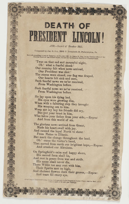 a. Following title: "Born February 12th, 1809:—Died April 15th, 1865."; composed April 23rd, 1865, by James D. Gay. Mourning border; bust of Lincoln within flagged wreath with mourning soldier and woman at sides. 26.7 x 19.8 cm.