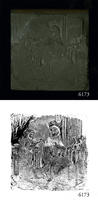 Woodblock for printing an illustration of a girl standing next to a boy who is seated at a table. |