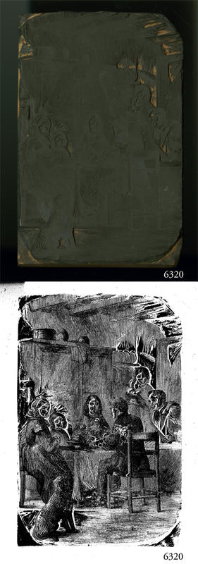 Woodblock for printing an illustration of adults and children seated around a dining table. |