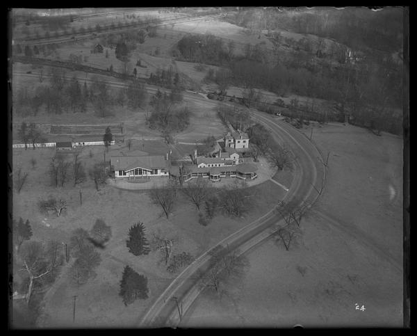 Aerial view of Belmont Mansion on Belmont Mansion Drive in Fairmount Park, Philadelphia in winter. View is slightly southwest to northeast and shows structures in the complex which no longer exist (possibly built for the 1876 Centennial Exposition). Abandoned railroad is visible. Built by William Peters ca. 1742-1751.