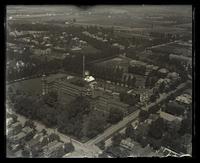Aerial view of the Hamilton Watch Company complex at Columbia and North West End Avenues in Lancaster, Pennsylvania. Surrounding homes and buildings are visible, along with croplands in the distance.