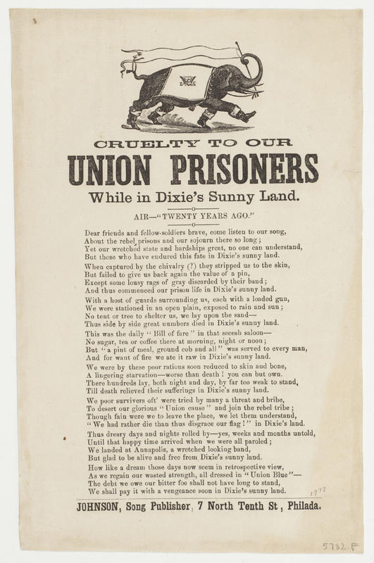 c. Title: "Cruelty to Our Union Prisoners While in Dixie's Sunny Land." Elephant wearing boots and carrying banner. 23.2 x 15 cm.