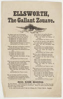 c. Title: "Song on the Death of Colonel Ellsworth, The Gallant Zouave"; Tune-Rosin the Bow, or Tippecanoe; cop: EDPa., 1861, J. Magee; publ. Magee. Letter paper; blue ink; Brownell and the dying Ellsworth in red and blue. 24.5 x 19.3 cm.
