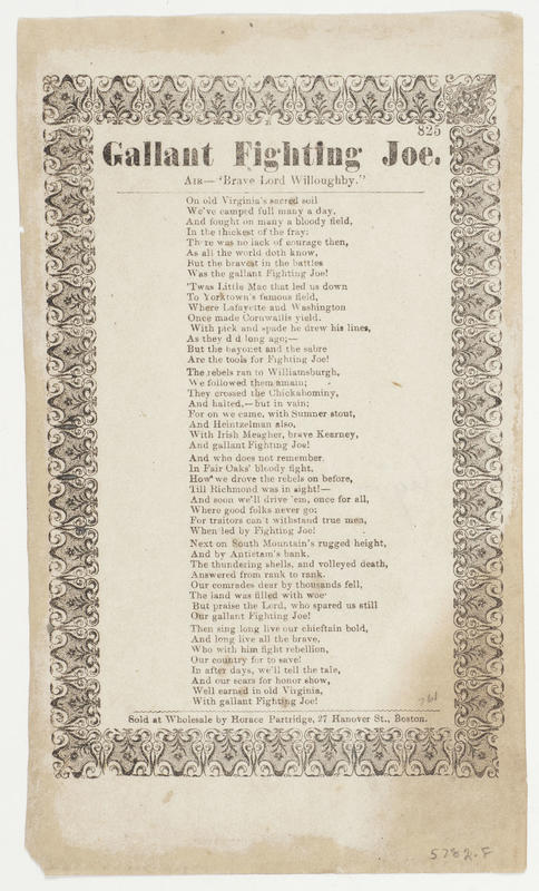 b. Title: "Song of the Potomac Veterans; or, Gallant Fighting Joe"; with first vs. set to music; adv: War Songs for Freemen;