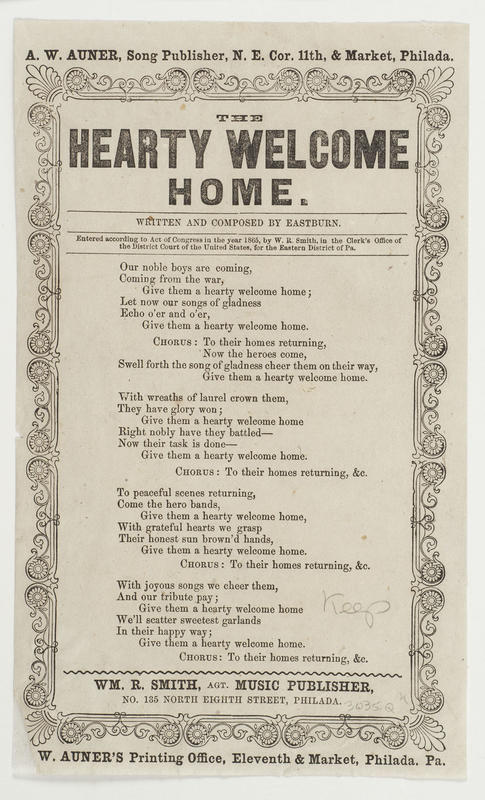 Our noble boys are coming (4 vs. and chor.) Written and composed by Eastburn; cop: 1865, W. R. Smith, EDPa.; Wm. R. Smith, Agt. Music Publisher; publ. Auner (5). A-J border. 22 x 13.5 cm.