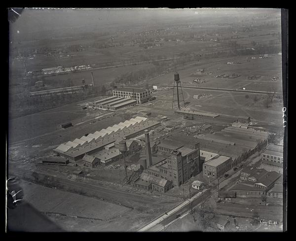 Aerial views of the the Mercer Automobile Company factory plant on Whitehead Road in Hamilton Township, New Jersey, north of Trenton. Mercer was an American automobile manufacturer from 1909 until 1925 notable for its high-performance cars, especially the Type 35 Raceabout. View shows several buildings and water towers that comprise the factory surrounded by a scattering of buildings, some likely residential, spread across a relatively open landscape.