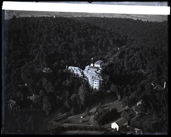 Aerial views of Galen Hall Hotel, a resort in South Heidelberg Township, Pennsylvania. The resort was originally built by James Skirrow Preston as a health resort. It was sold to the Galen Hall Company in 1911 and it was significantly expanded in 1912 with the addition of the Mountain Wing (pictured). The buliding was destroyed in a fire on April 7, 1963.