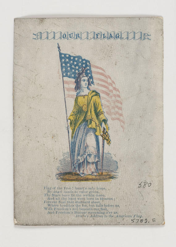 Flag of the Free! heart's only home (1 vs.) Drake's Address to the American Flag. Glazed card paper; blue ink; figure of Liberty with flag, col. 11.2 x 8 cm.