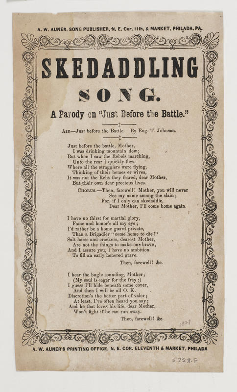 a. Title: "Skedaddling Song. A Parody on 'Just Before the Battle' "; with author's name spelled "Johnson"; publ. Auner (5). A-J border. 23.3 x 13.5 cm.