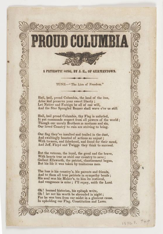 a. A Patriotic Song, by J.E., Germantown. A-J border; eagle with flag. 20 x 12.2 cm. |