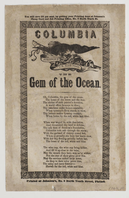 k. [Without chors.;] with title: "Columbia The Gem Of The Ocean"; adv: You will save 25 per cent, by getting your printing