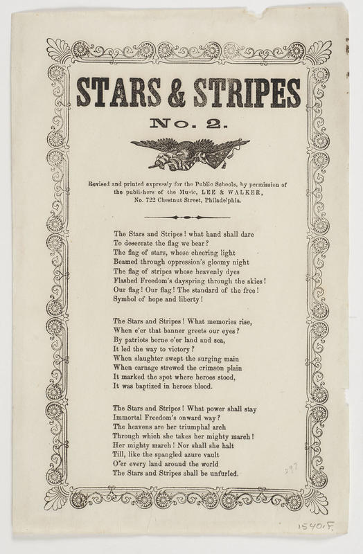 The Stars and Stripes! what hand shall dare (3 vs.) Revised and printed expressly for the Public Schools, by permission of the publishers of the music, Lee and Walker. A-J border; eagle with flag. 23 x 15 cm.