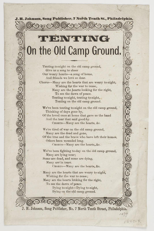 b. With hyphen in title; and "to-night", and "camp- ground" in first line; music publ. by Oliver Ditson and Co.; obtained of Firth, Son and Co.; publ. De Marsan (3). De Marsan ship border, with war scenes in lower corners. 25.8 x 16.9 cm.