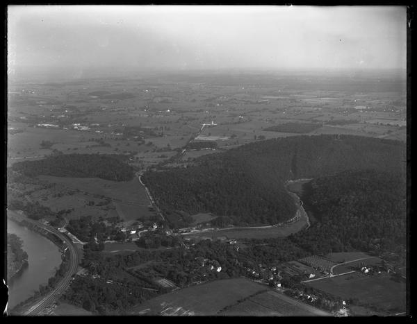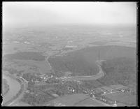 Aerial view of Valley Forge National Historical Park. The park is nationally significant as the site of the 1777-78 winter encampment of the Continental Army under General George Washington. View is from northwest to southeast. The Schuylkill River and railroad tracks along the river are visible. Probably taken September 12-16, 1922.