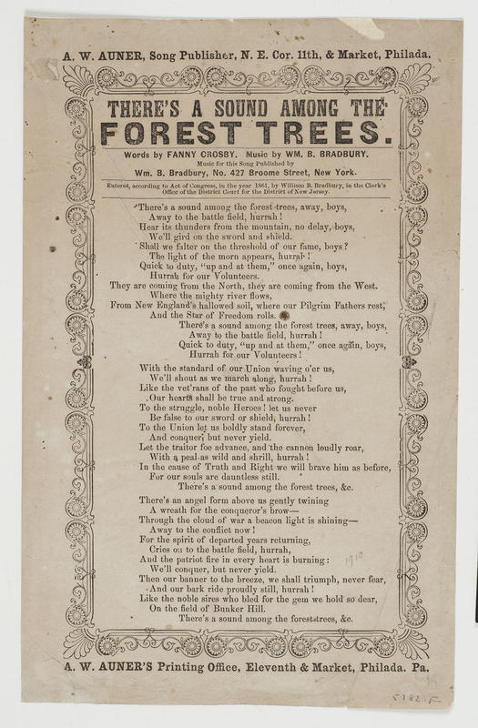 a. Words by Fanny Crosby; music by Wm. B. Bradbury; music publ. by Bradbury (2); cop: 1861, William B. Brad- bury, DN.J.; publ. Auner (5). A-J border. 23.5 x 15.5 cm.