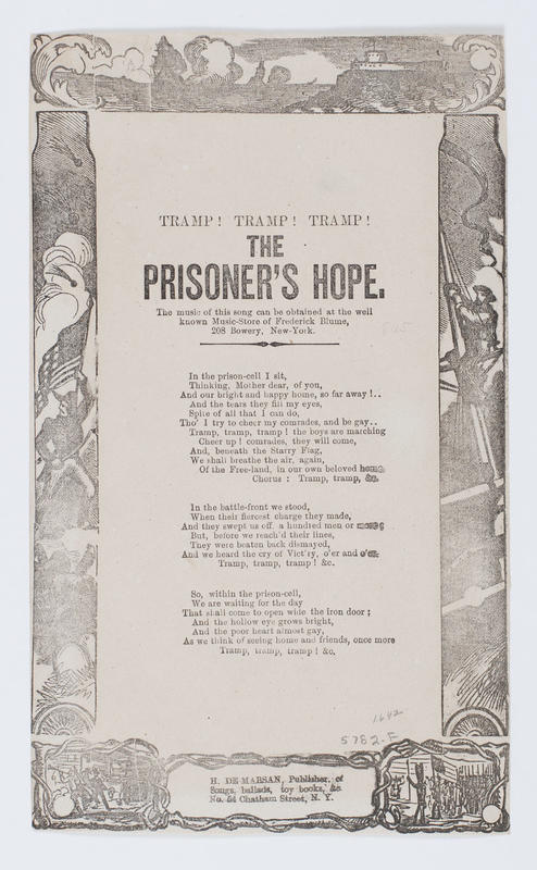b. Title: "The Prisoner's Hope"; [without "music ob- tained of";] published by James D. Gay; adv: All of Gay's Illustrated Army Songs Lithographed, and All of Gay's Il- lustrated Army Songs and Ballads, Sold Wholesale. T. o. border. 18.5 x 11.5 cm.