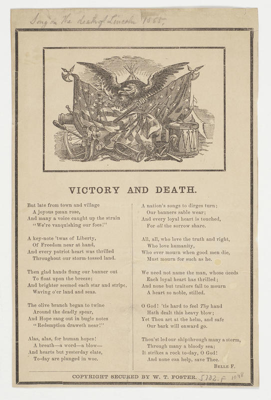 But late from town and- village (10 vs.) [Signed] Belle F.; copyright secured by W. T. Foster. Mourning border; eagle with flags, arms, and musical instruments. 20.1 x 13.1 cm.
