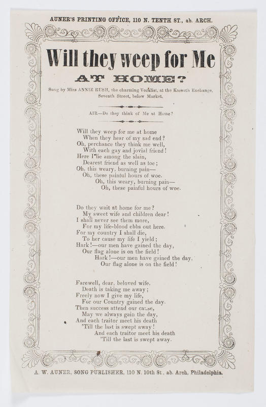 a. [Without author's name;] Sung by Miss Annie Rush, the charming Vocalist, at the Kossuth Exchange, Seventh Street, below Market; publ. Auner (3). A-J border. 22.2 x 14.5 cm.